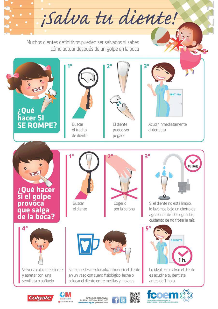 Llegó finalmente el verano, y muchas de las piscinas municipales ya han abierto sus puertas. Y con la diversión viene también los juegos y posibles lesiones dentales en los niños. Si algún diente de tu hijo sufre las consecuencias, esta imagen te indica lo que puedes hacer para salvarlo.